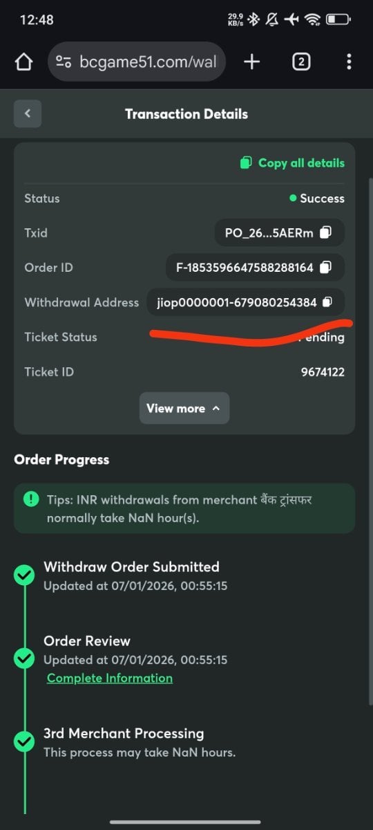 Order Details: Withdraw Amount: 947 INR Order ID: F-1853596647588288164 Status(f4): Success Fee: 36 INR Created Time: 07/01/2026, 00:55:15 Not received withdrawal to my bank account from 3 days ticket id still in processing from more then 48 hours And check this adress withdrawal shows wrong only 12 digits i also have provided my pdf statement while I have created ticket id there is also mentioned my name and correct account number how can withdrawal successful with wrong account number only 12 digits Check it it's 12 digits account number wrong how withdrawal shows successfull