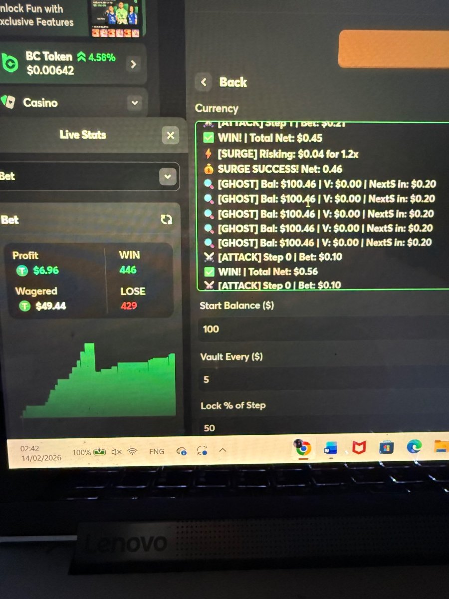 al System Hi everyone, I’ve been refining a new system for a while now, and I wanted to share the results. I call it the Analytical Vault (V11.0). Unlike basic scripts that just follow a fixed pattern, I designed this one with a "brain" that constantly re-calculates its own safety net. It operates across different mental states: GHOST mode for low-risk observation, ATTACK mode for calculated strikes, and a SURGE mode that compounds profits only when the session is going well. The most important part is the Vault mechanism. Every time the system hits a profit milestone, it automatically "locks" a portion of those winnings. It essentially moves the money to a safe area where the script can't touch it, while simultaneously tightening the Stop Loss to protect what’s already been earned. It’s built for players who are tired of winning and then losing it all in one bad streak. It’s about securing the green as you go. I’m looking to share this with a small group of serious, high-tier players. If you understand how a risk-management system like this works and you’re interested, reach out [email protected]