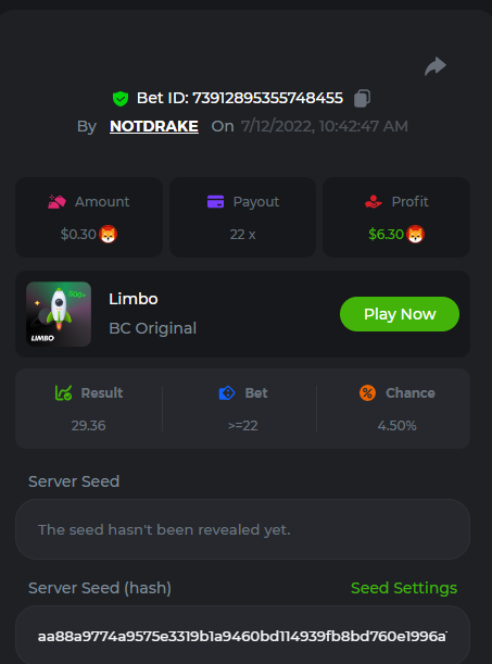1. don't know how i can get the url for these bets but they are in my transaction history. https://hash.game/sd/?sd=10Q525VMSYVSWJ