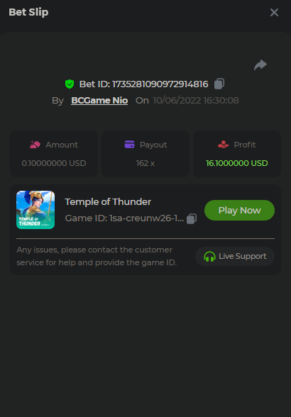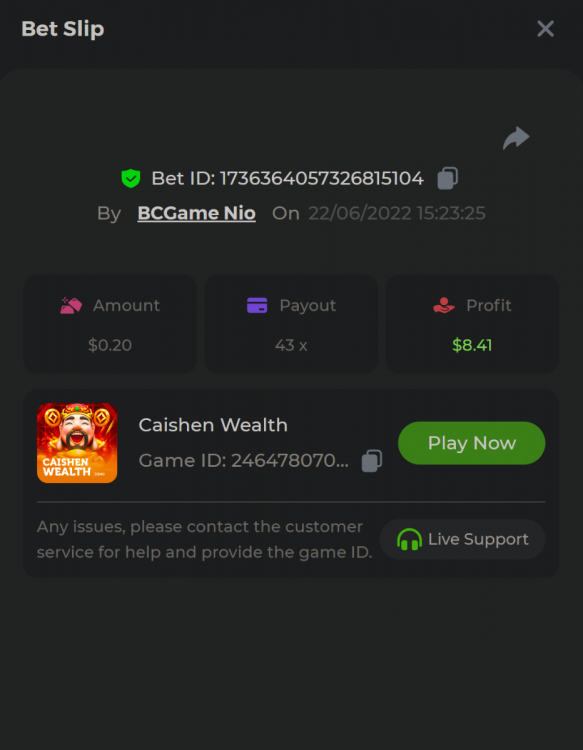 Hello Dear VIPs! We are thrilled to announce our weekly event - a Booongo battle with a prize pool of up to $4,000. If you haven't had the chance to participate before, you should consider it here. So what are the details? This will be a week-long battle starting on June 22nd and ending on June 29th. Players need to hit the highest multipliers on six selected slots and payouts will be added together to rank. Anyone who completes the bonus will receive 10% of the prize equally. The prizes in this challenge will go within 72 hours after the event ends. (details below). Eligible Games Win the highest multiplier on the Booongo slots listed below Sun of Egypt 3 Caishen Wealth Hit the Gold Tiger Jungle Candy Boom Happy Fish The highest multiplier reached in each game will be added together and counted as total points. Bonus buys are allowed. If the player submits multiple winning entries for the same game, the entry with the highest multiplier will be valid. Minimum VIP Tier Must be VIP04 or higher in order to enter this event. Minimum Payout Minimum payout to qualify is 10x (in any game) for a valid entry. Minimum Bet Size Sun of Egypt 3 - $0.25 Caishen Wealth - $0.20 Hit the Gold - $0.25 Tiger Jungle - $0.25 Candy Boom - $0.20 Happy Fish - $0.20 Eligible Coins All cryptocurrencies are eligible (excepting JB, and BCL). Free Play Mode is not valid for this event. Prize Pool & Reward Breakdown The winners will win a share of the prize pool based on the detailed ranking below. Anyone who completes the side bounty will receive a share of a 10% of the prize pool. BOUNTY - Join the Bounty of 80x! Share a bet that shows exactly 80x payout on any of the six games within the timeframe of this Battle and you will receive a share of 10% of the prize pool! If nobody wins exactly the payout, the player/s closest to the payout will win this bounty! Original rules apply with a minimum bet, minimum payout & VIP. How to Enter Access the game to select your Bet ID, click on the Share icon (↷) and then Copy link. Return to the topic, paste the link in the field "Reply to this topic..." E.g.: https://bc.game/sd/?sd=10N7HPDUEVMXHV Each eligible entry must have the Bet Slip URL, the non-inclusion of the link will disqualify participation in the event. In the same post, upload a screenshot of your win by clicking the game ID WITH VIEW IN USD mode ENABLED (accessible at the bottom of dropdown menu for your wallet up top, and Submit Reply. Done! This way, we can ensure that your bet indeed met the minimum requirement at the time of placing it: Example post - Link: https://bc.game/sd/?sd=10N7HPDUEVMXHV Good luck everyone!