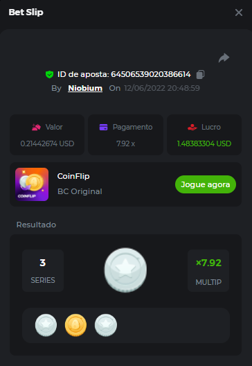 $2.5k Prestige Coinflip Challenge #34 Welcome back VIPs! Are you excited about the weekly event? Today we are giving away $2,500 in prizes from our Prestige challenge. The game we've selected is in-house Coinflip, where the Top 10 will take home a major prize, and the remaining $700 will be split between all other players. Moreover, there are several prizes, such as a share of the $500 prize pool for anyone who completes the extra bounty. The world is built on a foundation of two sides! Test which side you belong to. What's the Challenge? Complete as many of the following payouts on our in-house Coinflip. Each payout you hit above counts as 1 point, with a maximum of 10 points. | 3.96x | 7.92x | 15.84x | 31.68x | 63.36x | 126.72x | 253.44 | 506.88x | 1013.76x | 2027.52x | If there is a tie, the player with the higher average bet amount (in USD) shall be the winner. If there is a tie in the amount and number of payouts, the one who posted or edited his post first will be considered in the Ranking. Minimum VIP There's no minimum VIP level Eligibility to Win Prize Win at least 2 payouts to qualify. Minimum Bet Size $0.20 USD equivalent Eligible Coins All cryptocurrencies are eligible (excepting JB) Available Prizes 1st Place....... $500 2nd Place..... $300 3rd Place...... $200 4th Place......$100 5th Place......$50 6th-10th.........$30 All other participants.........$700 Bounty Prize...$500, equal share. EXTRA BOUNTY Share a winning bet with a 500x multiplier or more (9 Flips in a row) and receive an equal share of the $500 prize pool! Original rules apply with all minimum requirements. How to Enter To enter, copy the link of the bet you'd like to submit. Once you've copied it, paste it as a reply to this thread like so: Link: https://bc.game/sd/?sd=10MKHIJU5AV8K3 In the same post, upload a screenshot of your win by clicking the game ID WITH VIEW IN USD mode ENABLED (accessible at the bottom of dropdown menu for your wallet up top. This way, we can ensure that your bet indeed met the minimum requirement at the time of placing it: Link: https://bc.game/sd/?sd=10MKHIJU5AV8K3 Please combine all of your hits together in a SINGLE post. Edit your existing post for additional hits, don't create a new post. Each eligible entry must have the Bet Slip URL, failure to include it will disqualify participation in the event. Bet Slip image is not mandatory. Bets must be posted within 24 hours of placing bet in order to keep things fair for everyone. Bets must be made during the specified time window stated above. This thread will lock automatically when the time period is over. One (1) entry per household. Anyone found attempting to win multiple prizes will be disqualified from this challenge as well as all future challenges. Failure to follow instructions will result in your submission being null and void. By entering this challenge, you acknowledge that BC.Game has the final decision on results and placement. Payouts will be made within 72 hours of challenge completion, please be patient, we promise you that we haven't forgotten. We check and double check to make sure the rightful winners receive their prize. Prizes will be paid out in BCD. Good luck everyone!