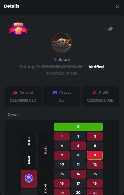 $4k Top Tier Roulette Challenge #15 Welcome to fabulous Las Ve... fifteenth Top Tier Challenge! Week's event will be at our in-house Roulette Single Player, with a prize pool of up to $4,000. Roulette and luck have something in common: they're casual and have a minimal probability of happening, but can happen and chases those who don't expect it. What's the Challenge? Participants must win as many consecutive bets as they can by selecting the color Red or Black (On in-house Roulette Single Player game). Consecutive bets must be of the same color to validate the entry. Rank will be determined by the largest amount of consecutive bets, the longest sequence will be in 1st place and successively. In the event of a tie, the advantage will be given to the highest average bet in dollars. In the event of a tie again, the first bet placed will have the advantage. So keep calm and place your bets, because what happens in BC, stays in BC! Minimum VIP Tier Must be VIP04 or higher in order to enter this challenge. Minimum Bets Win at least 3 consecutive bets to qualify, selecting the color Red or Black (Consecutive wins must be the same color). Minimum Bet Size $0.50 USD equivalent Eligible Coins All coins are eligible (excepting JB/BCL) PRIZE POOL & REWARD BREAKDOWN How to Enter Access the game to select your Bet ID, click on the Share icon (↷) and then Copy link. Return to the topic, paste the link in the field "Reply to this topic..." E.g.: https://bc.game/sd/?sd=10HF4NTB79MKNN In the same post, upload a screenshot of your win by clicking the game ID WITH VIEW IN USD mode ENABLED (accessible at the bottom of dropdown menu for your wallet up top, and Submit Reply. Done! This way, we can ensure that your bet indeed met the minimum requirement at the time of placing it: Link: https://bc.game/sd/?sd=10HF4NTB79MKNN Please combine all of your hits together in a SINGLE post. Edit your existing post for additional hits, don't create a new post. Bets must be posted within 24 hours of placing bet in order to keep things fair for everyone. Bets must be made during the specified time window stated above. This thread will lock automatically when the time period is over. One (1) entry per household. Anyone found attempting to win multiple prizes will be disqualified from this challenge as well as all future challenges. Failure to follow instructions will result in your submission being null and void. By entering this challenge, you acknowledge that BC.Game has the final decision on results and placement. Payouts will be made within 72 hours of challenge completion, please be patient, we promise you that we haven't forgotten. We check and double check to make sure the rightful winners receive their prize. Prizes will be paid out in BCD. Good luck everyone!