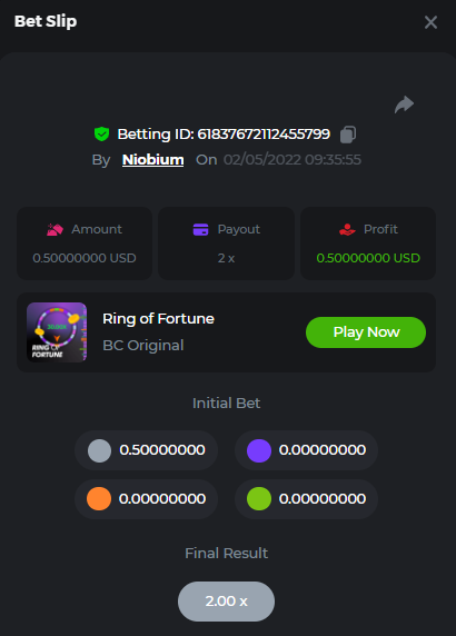 $2k Prestige Ring of Fortune Challenge #28 ◌ We are delighted to welcome you to our event and we hope you enjoy our new game: the Ring of Fortune! Sometimes all you need is a little splash of color, but the challenge today is to guess the right color. Then hey everybody, listen up! The prize pool is $2,000, and the Top 10 will take home a major prize, whereas every eligible entry will also get a share of the pool. Believe it or not, colors speak louder than words and here they are saying: "come on, it's a child’s play, anyone can do that!" so choose your color to color up your wallet! What's the Challenge? Participants will need to win four bets in the following colors: Grey, Orange, Purple and Green (On in-house Ring of Fortune game). Colors must be selected individually, the first bet for Gray, the second for Orange, and so on. Additional Information Prizes will be determined based on the bet amount. Whoever hits the highest multi (i.e 99x) with highest bet amount will take first place and so on. Bets and multipliers can be in any order and need not be consecutive. In case of tie, we will take the average bet amount of all 4 multipliers combined. In case of tie again, whoever posted/edited their entry first will be given an advantage. Minimum VIP Tier Must be VIP04 or higher in order to enter this challenge. Eligibility to Win Prize Win at least 4 bets to qualify by selecting each color individually. It's not allowed to select other colors in the same round. Minimum Bet Size $0.05 USD equivalent Eligible Coins All cryptocurrencies are eligible (excepting JB) Available Prizes 1st Place....... $500 2nd Place..... $300 3rd Place...... $200 4th Place......$100 5th Place......$50 6th-10th.........$30 The remaining $700 will be split between all other participants who meet minimum requirements, min payouts, and minimum bet. How to Enter To enter, copy the link of the bet you'd like to submit. Once you've copied it, paste it as a reply to this thread like so: Link: https://bc.game/sd/?sd=10JOIL0BS3H0CZ In the same post, upload a screenshot of your win by clicking the game ID WITH VIEW IN USD mode ENABLED (accessible at the bottom of dropdown menu for your wallet up top. This way, we can ensure that your bet indeed met the minimum requirement at the time of placing it: Link: https://bc.game/sd/?sd=10JOIL0BS3H0CZ Please combine all of your hits together in a SINGLE post. Edit your existing post for additional hits, don't create a new post. Bets must be posted within 24 hours of placing bet in order to keep things fair for everyone. Bets must be made during the specified time window stated above. This thread will lock automatically when the time period is over. One (1) entry per household. Anyone found attempting to win multiple prizes will be disqualified from this challenge as well as all future challenges. Failure to follow instructions will result in your submission being null and void. By entering this challenge, you acknowledge that BC.Game has the final decision on results and placement. Payouts will be made within 72 hours of challenge completion, please be patient, we promise you that we haven't forgotten. We check and double check to make sure the rightful winners receive their prize. Prizes will be paid out in BCD. Good Luck to Everybody!