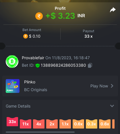 15. 22x 0.15$ - https://bc.game/#/sd/11FOS8Q84IM9YB - Bet ID: 124823577961693305 33x 0.15$ - https://bc.game/#/sd/11FOSULG15JLT3 - Bet ID: 124823577961693420 44x 0.15$ - https://bc.game/#/sd/11FOTZOPD4ZD8R - Bet ID: 124823577961694600