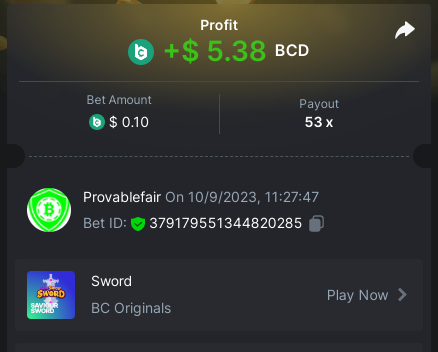 5. 20x - bet amount:0.32$ - Bet id: 9994389253566 - Bet link: https://bc.game/#/sd/11P1R1UXL5GQ4N
