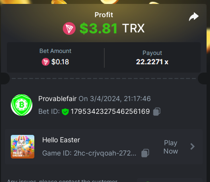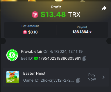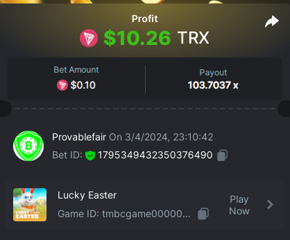 1. task done 17 out of 30 points Easy 1. Win a Crash bet with a 10x payout. Bet Amount 0.2$ - payout 10x - https://bc.game/#/sd/11W05LAVJ0XRDV - betid 1795325633233020674 2. Get a 10x payout on a Classic Dice bet. Bet amount 0.1$ - Bet ID: 9994389254345 - https://bc.game/#/sd/11W04DAUSPUQLN 3. Get a 10x payout on the Run Away Zumbies. Bet Amount 0.2$ - Payout 80.3106 x - https://bc.game/#/sd/11W0KIE8VXJPMF - Bet ID:1795339805452732712 4. Win a 'Tie' 9x bet on the Baccarat. - bet 0.12$ - https://bc.game/#/sd/11VZYA5O9WTSHN - Bet Id 443334654666211352 5. Get a 20x payout on the John Wild. Bet amount 0.1$ - payout 20.902x - https://bc.game/#/sd/11W0GYKZI9NE6F - Bet ID:1795337202902585386 6. Win a Twist bet on 15.5x payout (3rd Purple Gem). bet 0.1$- 15.5x - https://bc.game/#/sd/11W00W2HE7XUUZ - betid 443343283255509488 7. Win a Sports bet with minimum odds being 1.5x (singles only) 2$ base min amount. Ticket Id 2386880115666727018 - odds 1.871x bet 100 tron (11$+) - 8. Get a minimum 20x multi on BGaming Hello Easter slot. Bet Amount 0.18$ - Payout 22.2271 x - https://bc.game/#/sd/11W0M2A9IMSF3V - Bet ID:1795342327546256169 9. Get a minimum 30x multi on Red Tiger Lucky Easter slot. Bet Amount 0.1$ - Payout 103.7037 x-https://bc.game/#/sd/11W0T1253QL30F - Bet ID: 1795349432350376490 10. 2FA enabled , E-Mail & Phone Number verified. Medium 1. Win a bet in Roulette Single with betting on 0 only (36x). (no spread bets) Bet Amount 0.1$ - payout 36x - https://bc.game/#/sd/11W0G3KI2UCN0B - Bet ID:160147613797056952 2. Get a 76x on Plinko. Bet Amount 0.1$ - Payout 76x -https://bc.game/#/sd/11W0FBW34H0ZNF - Bet ID:138896824286067710 4 Win a Sports bet with minimum odds of 2x (singles only) 2$ base min amount. Ticket Id 2386880698159079982 - odds 2.21x bet 45 tron (5$+) - 8. Get a minimum 90x multi on BGaming Easter Heist slot. Bet Amount $0.10 - Payout 136.1364x - https://bc.game/#/sd/11W2937HDYZ1R7- Bet ID:1795402318880305961 Hard 1. Get a 29.70x on Wheel (30 segments, High risk). Bet Amount 0.1$ - Payout 29.7x - https://bc.game/#/sd/11W01J42QJW7EV Bet ID: 443346852373331982 2. Get a 420x on Plinko (14 rows, High risk). Bet Amount 0.1$ - Payout 420x - https://bc.game/#/sd/11W0CA75CTHUGR - Bet ID: 138896824286066571 7. Win a bet on Keno Single by selecting numbers 10, 11, 12 and 13, High risk, (259.00x). Bet Amount 0.1$ - payout 259x - https://bc.game/#/sd/11W08UETLZH4BV - BetID :346870049975306801
