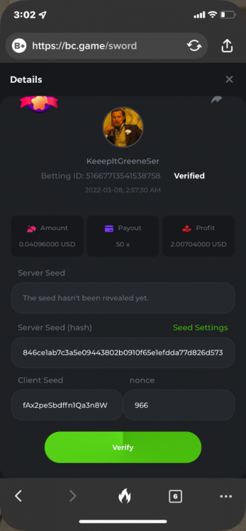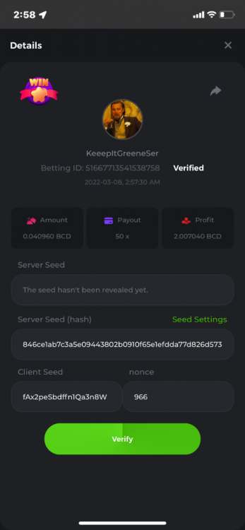 1. create: keeepitgreenser plinko - must hit 630x and bet ID must have 63 in it mines - 6 mines 15 diamonds, 15 mines 6 diamonds payout bet ID must end in even number Egytian - must hit freespins with 4 scatters and payout over 25x Limbo - payout of 1111.11x and bet ID must have 1 somewhere in it thanks