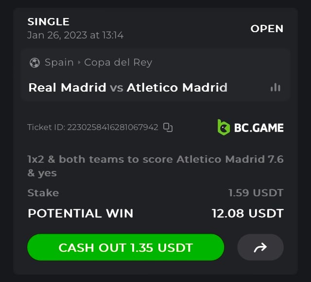 Tato_123 Posted January 26, 2023 Share Posted January 26, 2023 EspañaCopa del Rey Real Madrid CF vs Atlético Madrid 26/junary/20:00 utc event:https://bc.co/es/sports?bt-path=%2F1%2F1669817290067152896%2F1669817290121678848%2F2228547355811131395 Let's go everyone! Challenge: Which team will win the match, how many goals, winning times, etc.? Raise your bets in English! if it is in another language it will be null All bets on this event are validone bet allowed Betting slips must be posted open! Before the general fix at the end of the game.The bet slip must be published before the start of the match.Edited posts will not be considered The minimum bet size is: $1.5 The highest base bet, with the correct bet (the winning team) will win it prize 1.........6BCD 2nd...... 4BCD 3rd.......2.5BCD Choose your result and get the reward Link to comment Share on other sites More sharing options...