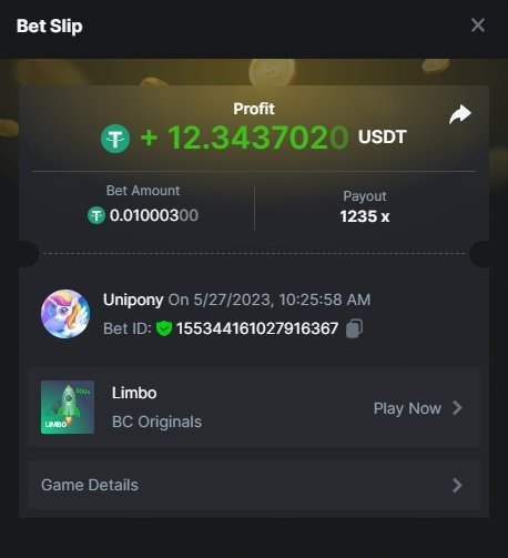 Maksypro Posted May 27, 2023 Share Posted May 27, 2023 Read Carefully Before Start To Hunt Daily Challenges #248 LIMBO ย Hunt : Win the highest pay out Min Payout requirement 100x Min Level 4 ๏ธDuration Starting : Now End time : 23.59 UTC Time How to Join? Make screenshot + paste your bet link + UID or Profile link Any coin, with min bet 0.01 USD is allowed (jb/bb/bcl not allowed) Reward Prizes 1st Place.....$7 BCD 2nd Place.....$5 BCD 3rd Place.....$4 BCD 4th Place.....$3 BCD 5th Place.....$2 BCD ๐ต Winners will be announcing next day after Roll Point! 1 Link to comment Share on other sites More sharing options...