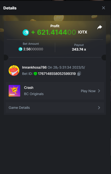 Maksypro Posted May 28, 2023 Share Posted May 28, 2023 Read Carefully Before Start To Hunt Daily Challenges #249 CRASH Hunt : Win the highest pay out Min Payout requirement 80x Min Level 4 ๏ธDuration Starting : Now End time : 23.59 UTC Time How to Join? Make screenshot + paste your bet link + UID or Profile link Any coin, with min bet 0.01 USD is allowed (jb/bb/bcl not allowed) Reward Prizes 1st Place.....$7 BCD 2nd Place.....$5 BCD 3rd Place.....$4 BCD 4th Place.....$3 BCD 5th Place.....$2 BCD ๐ต Winners will be announcing next day after Roll Point! 2 Link to comment Share on other sites More sharing options...