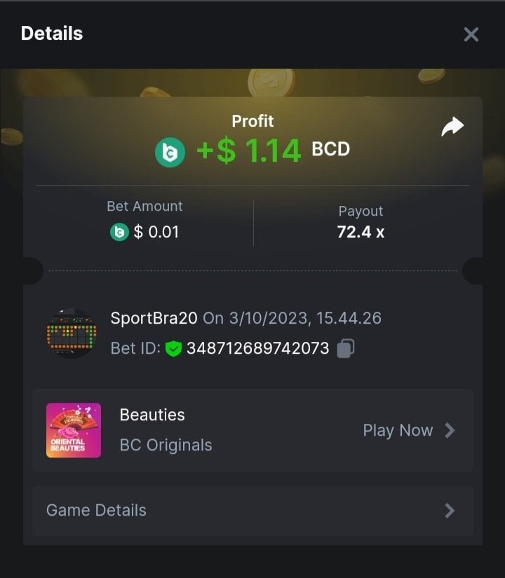 Moderator Giandreas Posted October 3, 2023 Moderator Share Posted October 3, 2023 Read Carefully Before Start To Hunt Forum Daily Challenges #376Hunt : Oriental Beauties Win the highest pay out Min Payout : x20 Min Level 4️Duration Starting : Now End time : 23.59 UTC Time How to Join? Make screenshot + paste your bet link + UID or Profile link Any coin, with min bet 0.01 USD is allowed (jb/bb/bcl not allowed)Reward Prizes 1st Place.....$7 BCD 2nd Place.....$5 BCD 3rd Place.....$4 BCD 4th Place.....$3 BCD 5th Place.....$2 BCD 🏵 Winners will be announcing next day after Roll Point! 2 Link to comment Share on other sites More sharing options...