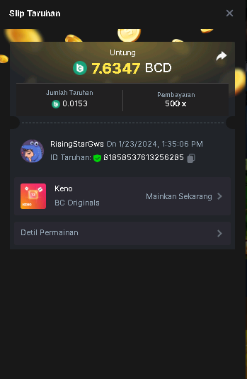 Moderator Giandreas Posted January 23, 2024 Moderator Share Posted January 23, 2024 Read Carefully Before Start To Hunt Forum Daily Challenges #488Hunt : Keno Win the highest pay out Min Payout : x90 Min Level 10️Duration Starting : Now End time : 23.59 UTC Time How to Join? Make screenshot + paste your bet link + UID or Profile link Any coin, with min bet 0.01 USD is allowed (jb/bb/bcl not allowed)Reward Prizes 1st Place.....$7 BCD 2nd Place.....$5 BCD 3rd Place.....$4 BCD 4th Place.....$3 BCD 5th Place.....$2 BCD 🏵 Winners will be announcing next day after Roll Point! Link to comment Share on other sites More sharing options...
