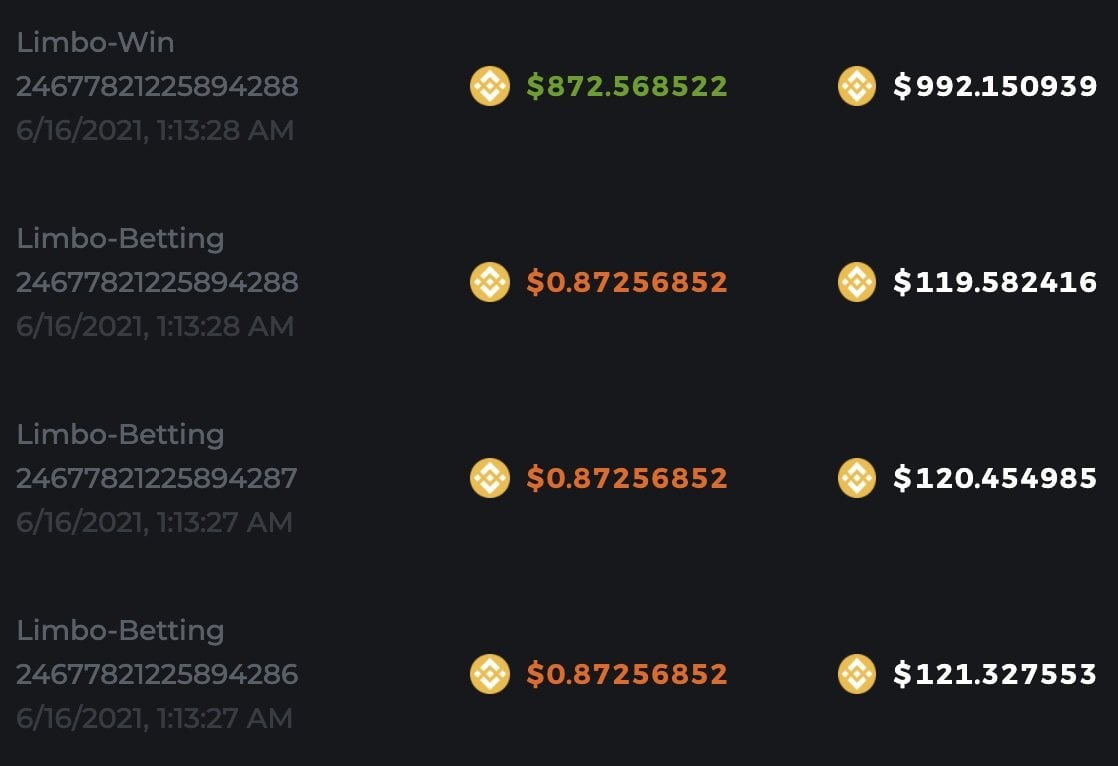 SkyBytez Posted August 18, 2021 Share Posted August 18, 2021 On 6/16/2021 at 6:12 AM, mostpalone said: This morning I was playing Limbo and was feeling ballsy so I decided to bet $0.09 at a 1000x multiplier. I was only planning on doing 100 bets total and was just hoping to win once, so I started autobet, and apparently I didn't notice that I'd accidentally bed $.90 instead of $0.09. In the luckiest moment of my life I won on the 4th bet for a $900 profit completely on accident, before I even had time to realize I'd accidentally bet 10x what I meant to! (in the pic the payout says $872 win but that's because I took it a few hours after the hit and the BNB price fluctuated a bit) Congratulations on your good fortune! I find incidents like these amusing. I myself had a similar situation. I was playing Hi-Lo on a higher bet than usual. I believe it was like $2, but either way. I was dealing with my child and holding phone in my hand and somehow hit some buttons. Well at the end of it I had a hundred and forty multiplier with a payout of almost $300. Completely on accident and super surprising in the end. Link to comment Share on other sites More sharing options...