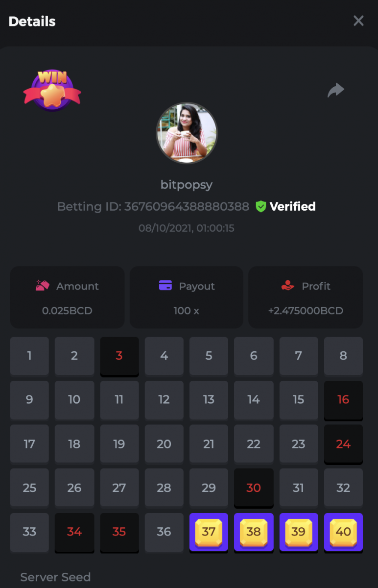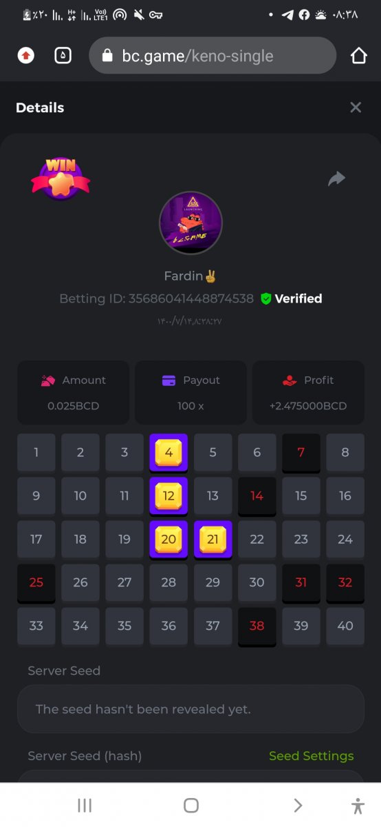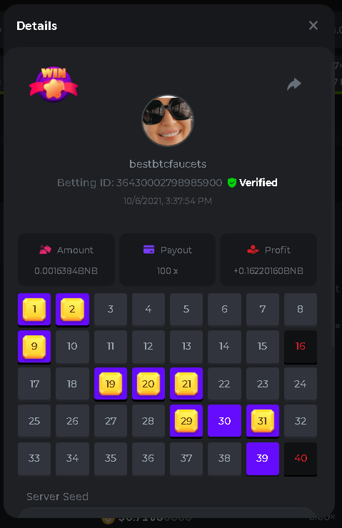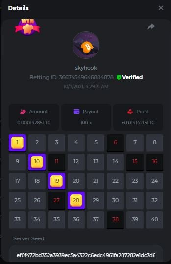 WOUNDED Posted October 4, 2021 Share Posted October 4, 2021 Welcome to keno single challeng In addition to the Top challenge,we also prepared a small challenge We hope you enjoy it Starts: 23:00 , 4 october CMT Ends: 23:00 , 8 october CMT What's the Challenge? Complete as many of the following 3 payouts on keno single(1 or all payouts) 26X _ 1 points 100X _ 3 points 259X _ 5 points The payouts must be EXACT hits - if you can't find a payout,try changing the risk level to medium or high Minimum VIP Tier Must be VIP4 or higher in order to enter this challenge. Minimum Bet Size $0.025 USD equivalent (please check the individual coin amounts below) - Bets made below this amount will not count Eligible Coins All coins are eligible (excluding JB) Available Prizes (single payout) 1points......$2 for 5 Winner 3 points......$3 for 5 Winner 5 points......$4 for 5 Winner Available Prizes (combined payout) 4 points......$6 6 points......$11 8 points......$16 9 points......$22 (For example,26X & 100X have 4 points) To enter,copy the bet ID of the bet you'd Once you've copied it,post it as a reply to this thread like so: Betting ID: 36383934979768508 In the same post,upload a screenshot of your win by clicking the game ID WITH VIEW IN USD mode ENABLED (accessible at the bottom of dropdown menu for your wallet up top.This way,we can ensure that your bet indeed met the minimum requirement at the time of placing it Please combine all of your hits together in a SINGLE post.Edit,don't create a new post Bets must be posted within 24 hours of placing bet in order to keep things fair for everyone Bets must be made during the specified time window stated above. This thread will lock automatically when the time period is over Each user is only allowed with one account Otherwise,the wrongdoer will be dealt with Failure to follow instructions will result in your submission being null and void Payouts will be made within 48 hours of challenge completion,please be patient Let's go Good luck Link to comment Share on other sites More sharing options...
