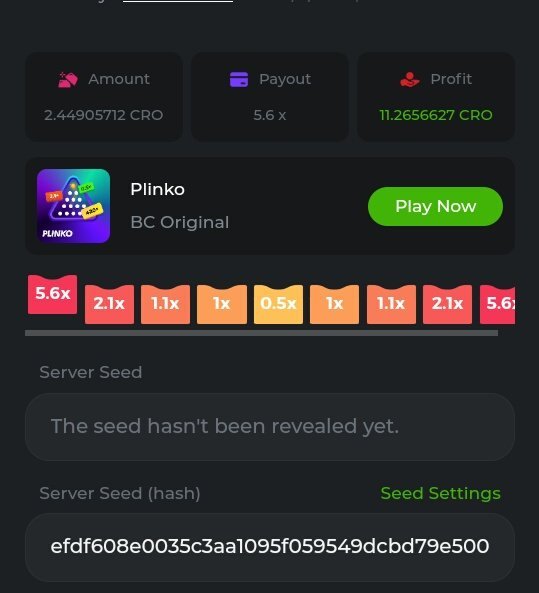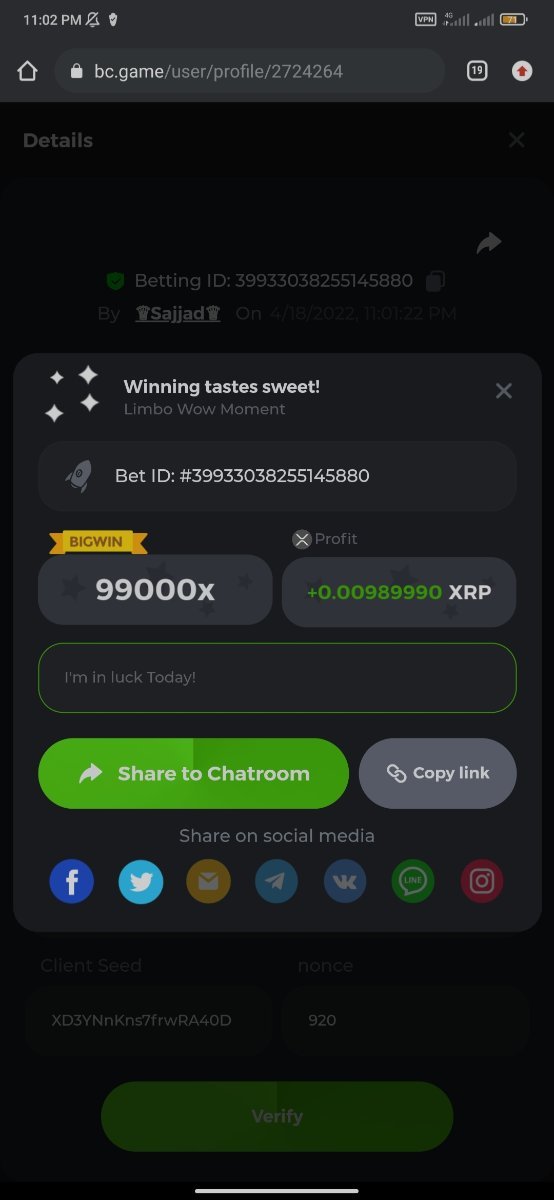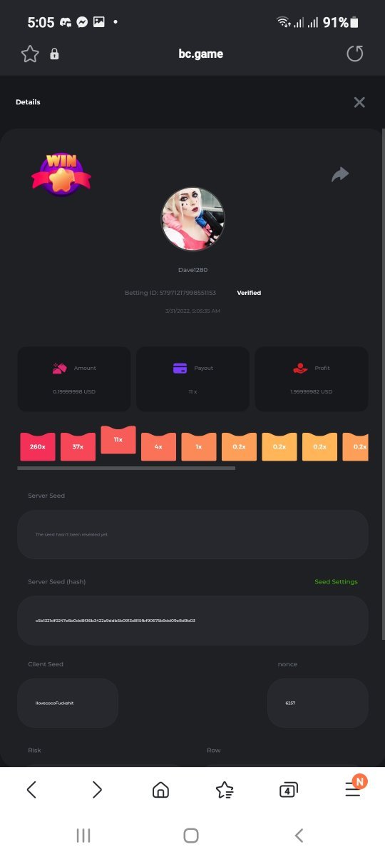 NotYourGuyBuddy Posted June 13, 2022 Share Posted June 13, 2022 About 4 months back I deposited 100 doge, worked it up to 2k doge then swaped to bcd and worked that up to 2k vaulted 1k just in case. Decided to jump on classic dice with a brand new seed betting 1 bcd hunting for that elusive 9900x multi. In 17 nonce the betting stopped when I hit the 9900x putting me over 12k bcd total. Swaped back to doge and celebrated with a withdrawal. Link to comment Share on other sites More sharing options...